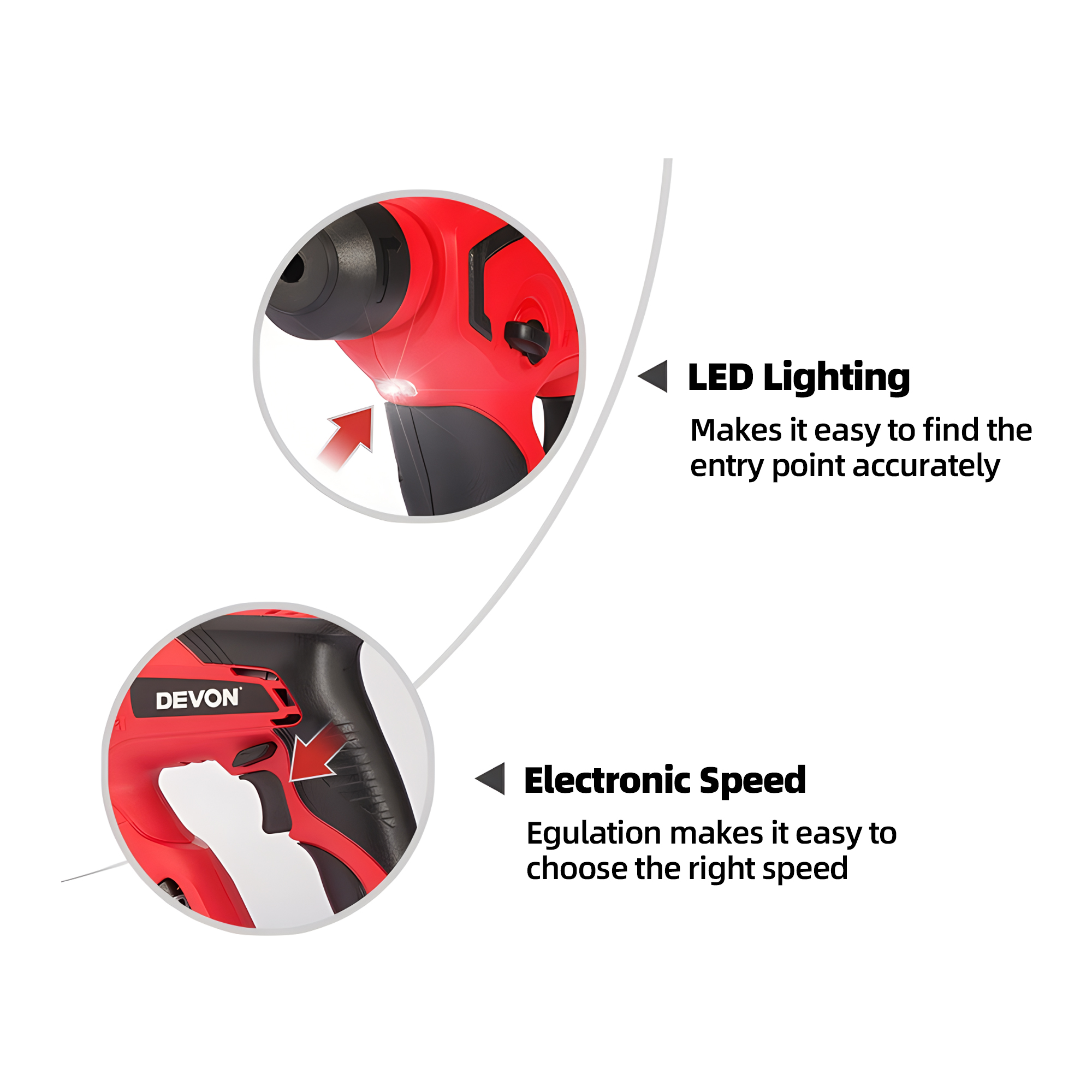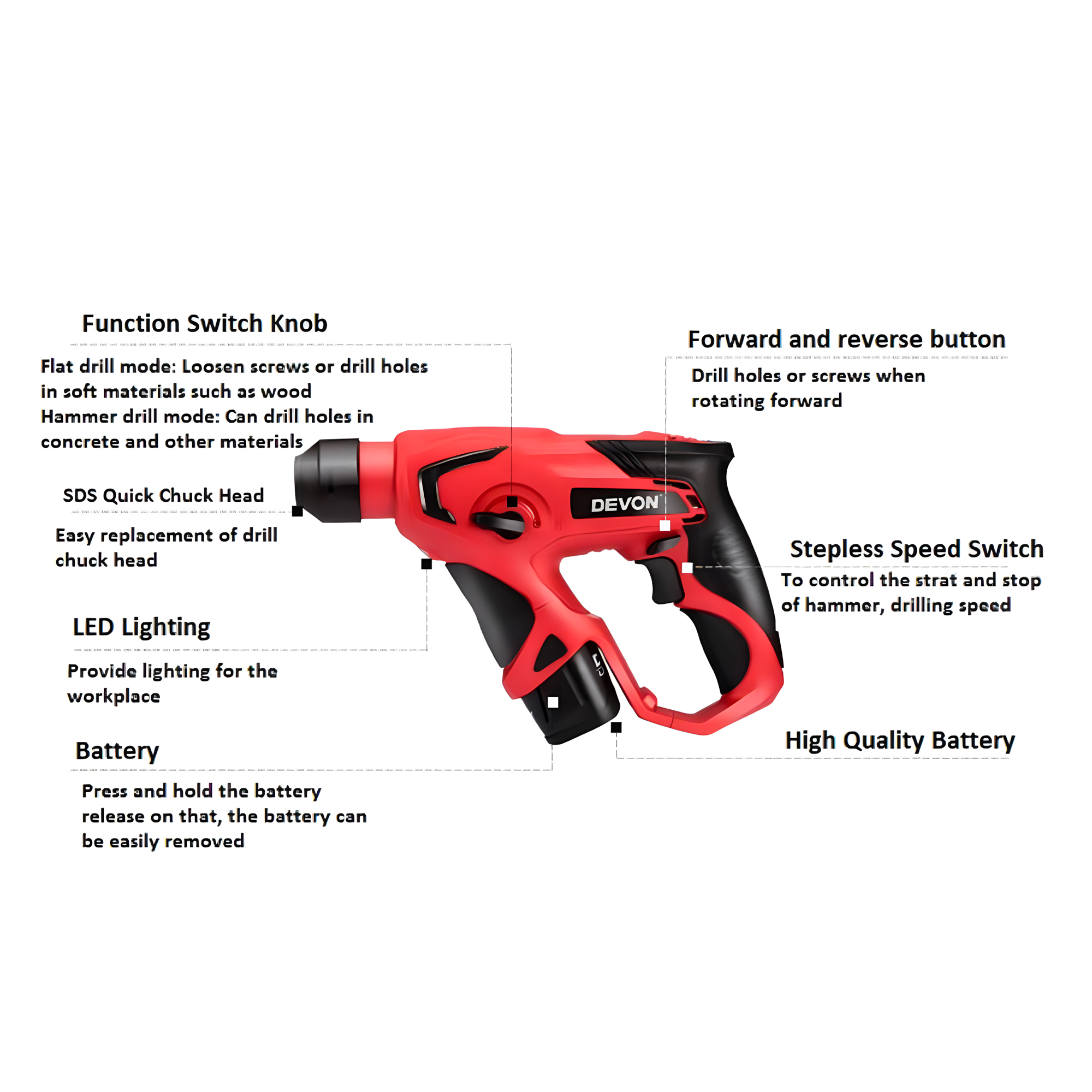 Hammer, drill and screwdriver functions.SDS quick change chuck, simple and convenient, fast switching.High-efficiency cylinder, compact structure, powerful impact.Imported motor, stepless speed control, electronic brake, excellent performance.LED work light to increase the brightness of the work area.
