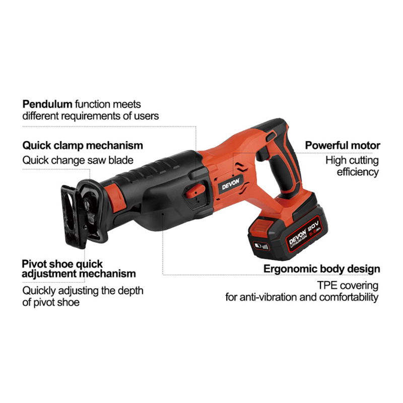 Compact and light cordless one-handed brushless reciprocating saw for everyday.Fast clamp structure for quick changing blades.Quick adjustment supporting plate for quick depth adjustment.Powerful motor with high cutting efficiency.fast saw blade changing Highest power to weight ratio Fastest cutting in the widest variety of materials.Lifting function for different requsts.
